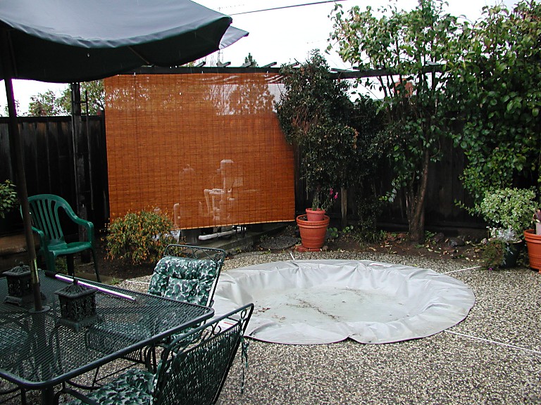 An awful curtain in the corner covers up some gadgetry related to the pool and jacuzzi.