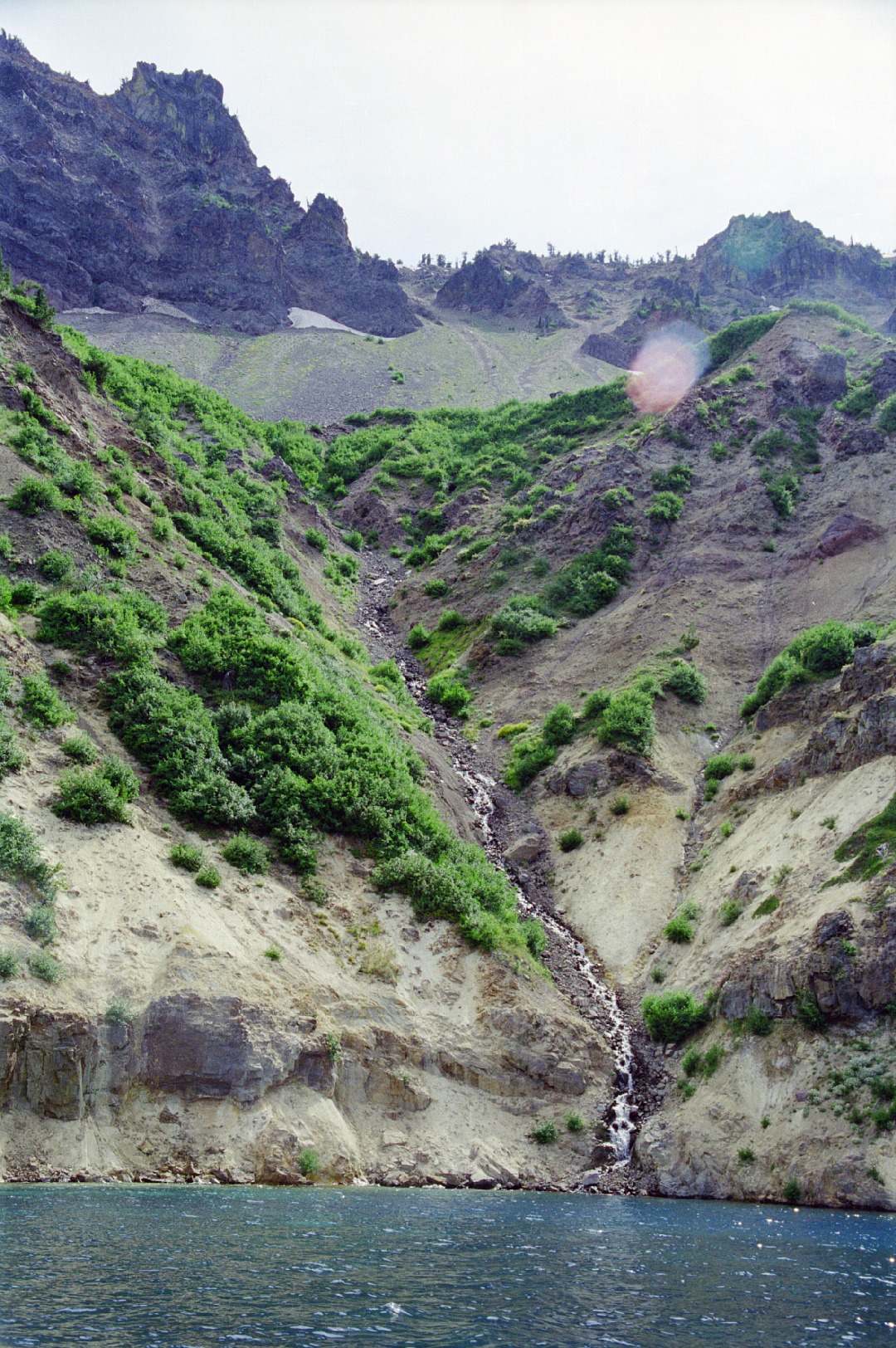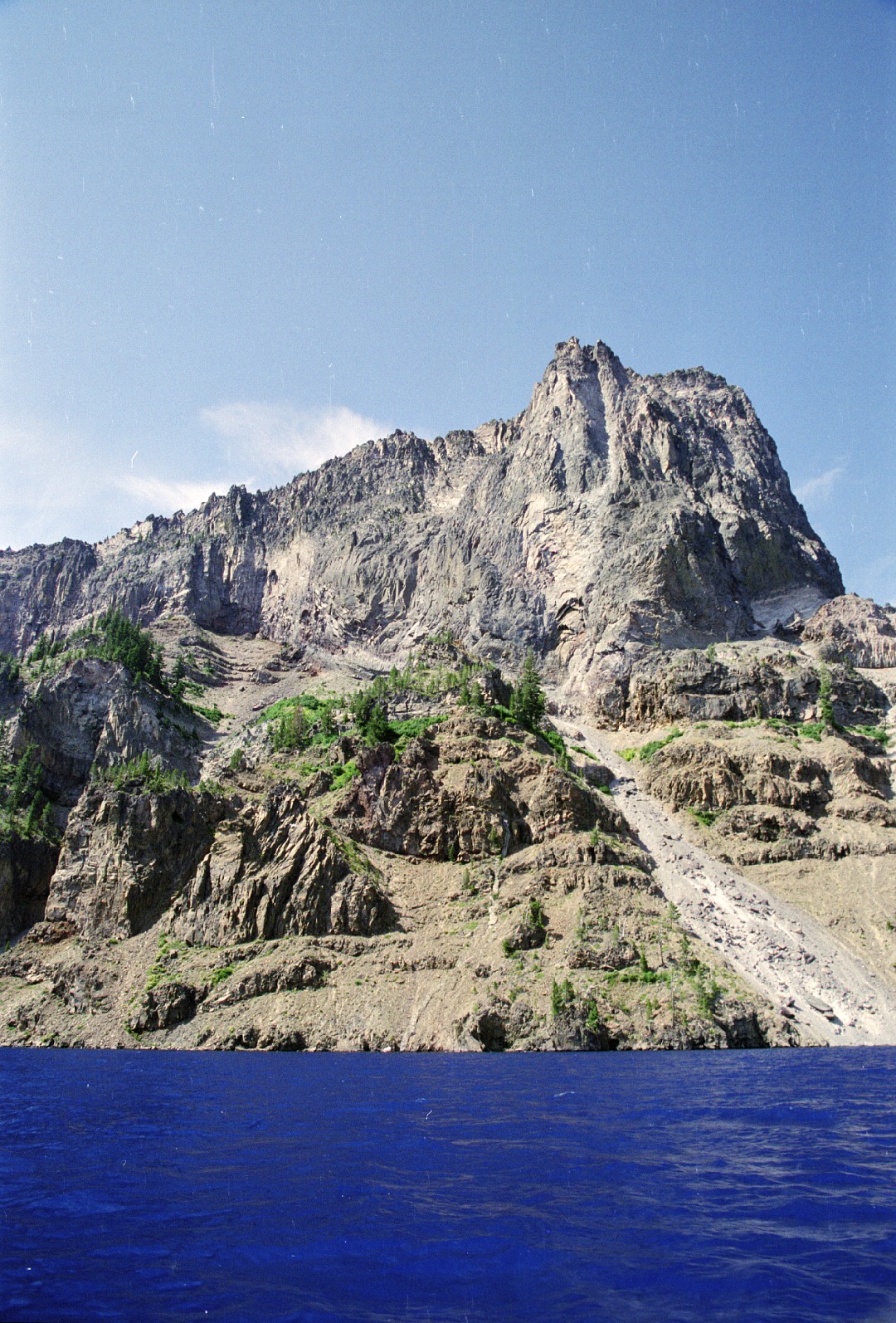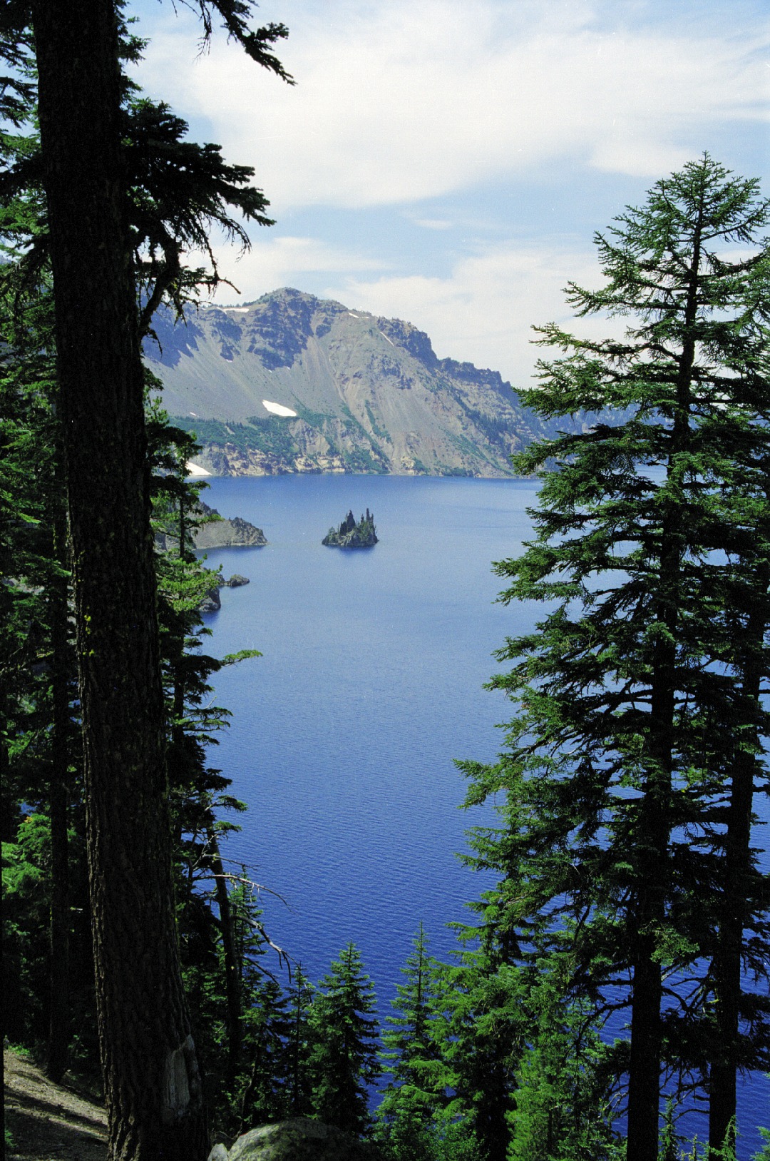 In a short while we were in FORT KLAMATH, looking for lodging. We got lucky at a second (and last) motel in town, and still had plenty of time to visit CRATER LAKE. There used to be a huge volcano here, Mt. Mazama, which exploded long ago and the remains fell in and created a hole, today filled up with waters of a lake, at about 6,000 feet elevation. The top of the crater rim is about 1,000 feet higher, the lake is some 2,000 feet deep (they're currently working on a project to map the depths with ultrasound — only 20 feet remain to make Crater Lake the deepest lake in North America). It is about 6 miles across in the widest spot, rarely freezes (last time in 1949). The lake's water is very clear, and comes exclusively from snow and rainfall, therefore being perfectly potable. That, and the general properties of light refraction, plus differences in absorption of various light colors while shining through the water, makes the lake unbelievably deep blue. There's an unexplained feature of the lake: it keeps constant water level. Logic suggests that it should swell when the snow melts (it snows about 30 feet a year here!), and recede in the summer heat, but it does not happen to the expected extent. A theory says that there is some underground overflow in the lake, letting extra water out. Another mysterious property of the lake is its constant chemical balance — saltier or dirty water drops to the bottom, from where it probably leaves through many underground streams.