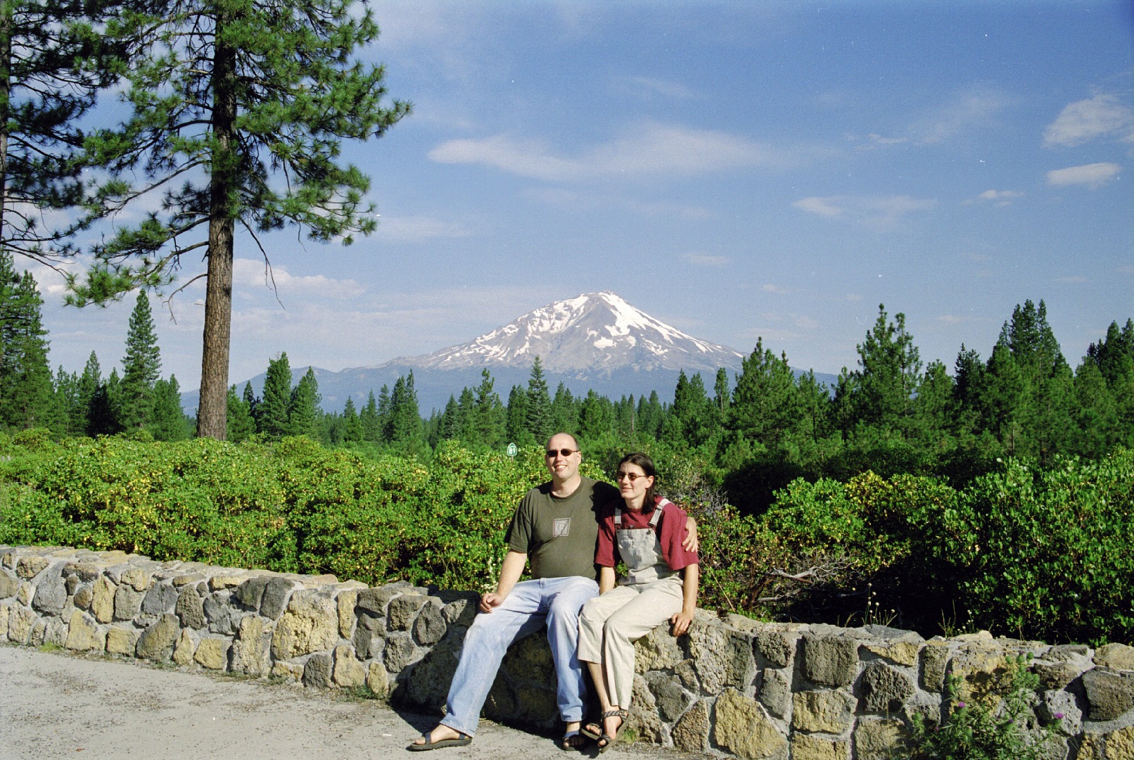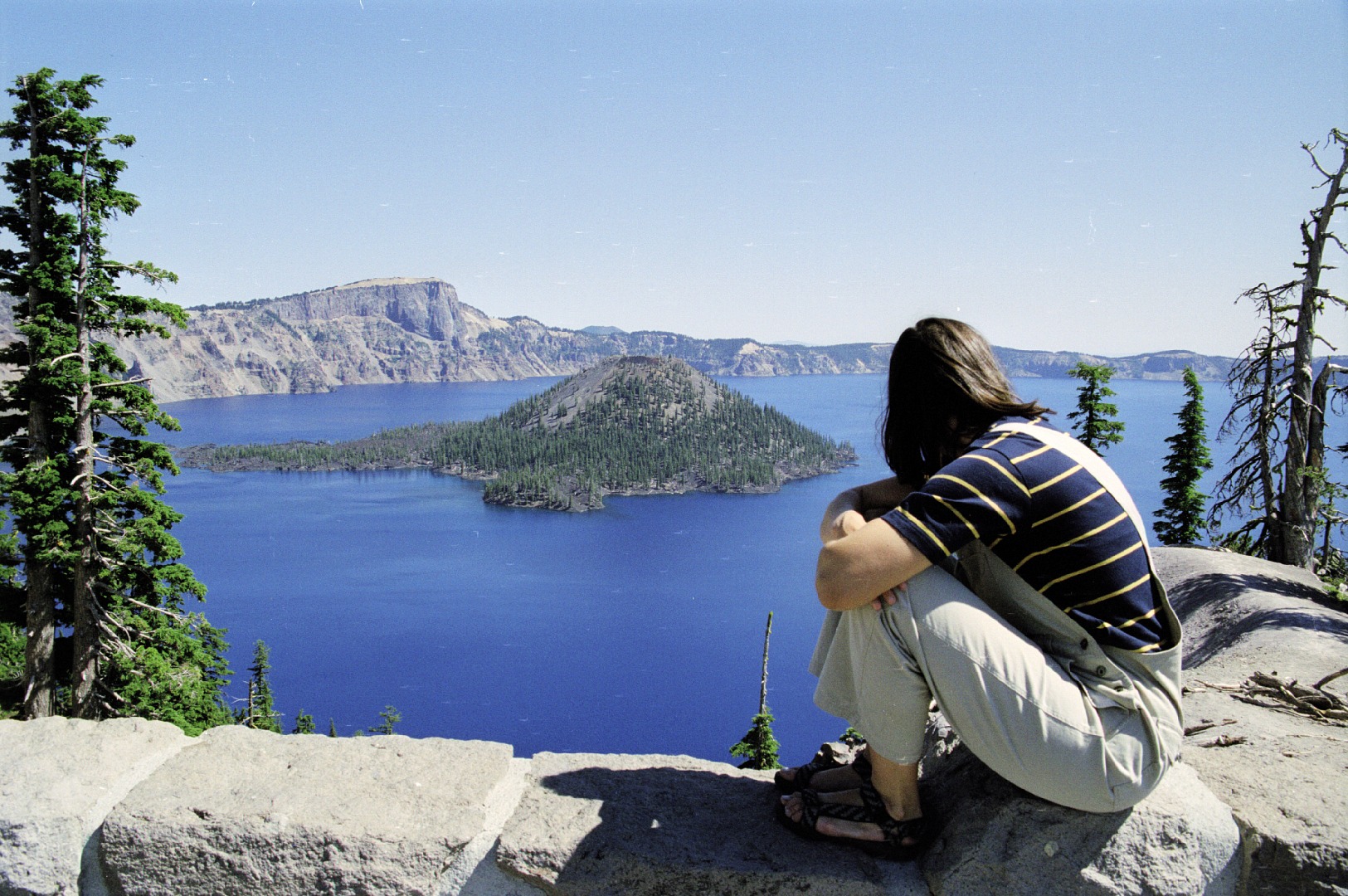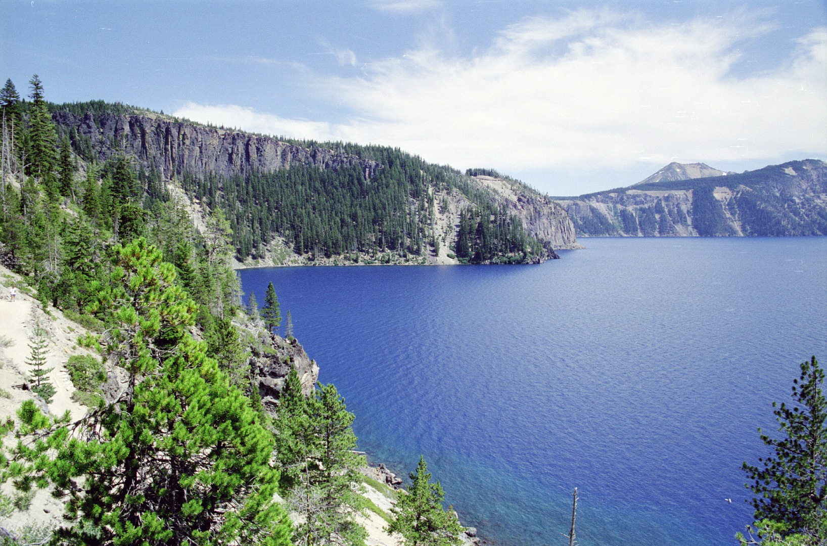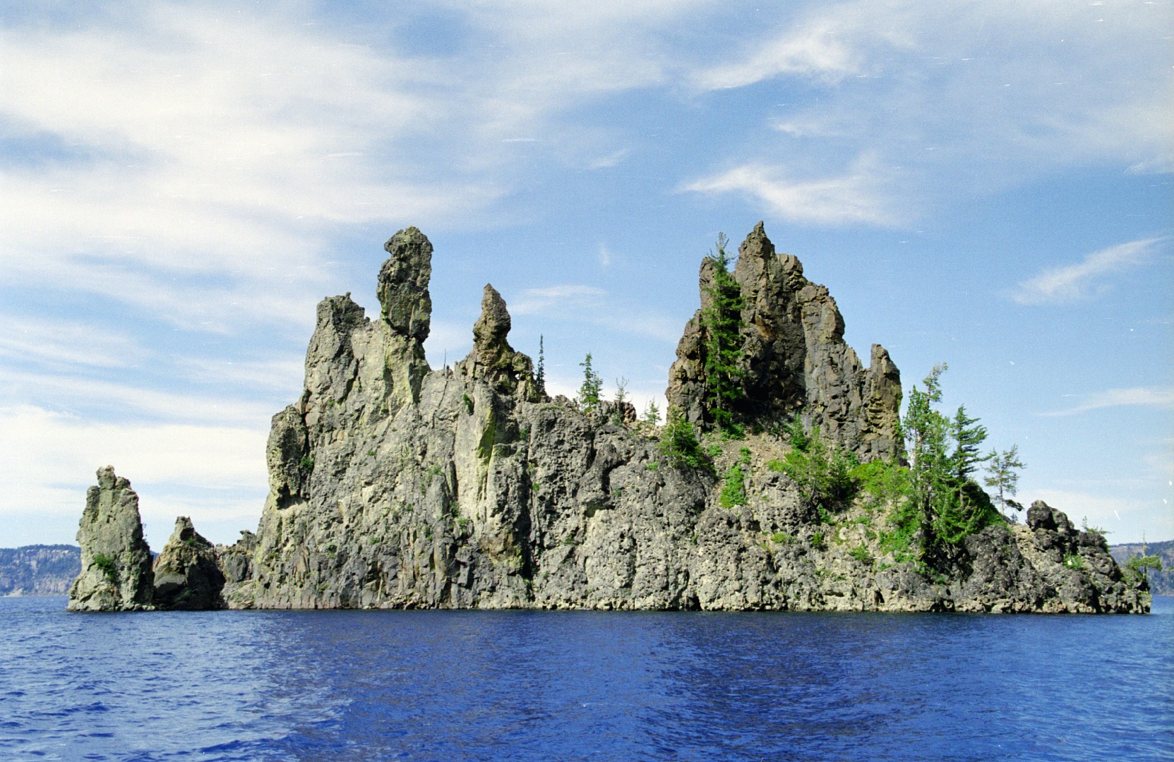 In a short while we were in FORT KLAMATH, looking for lodging. We got lucky at a second (and last) motel in town, and still had plenty of time to visit CRATER LAKE. There used to be a huge volcano here, Mt. Mazama, which exploded long ago and the remains fell in and created a hole, today filled up with waters of a lake, at about 6,000 feet elevation. The top of the crater rim is about 1,000 feet higher, the lake is some 2,000 feet deep (they're currently working on a project to map the depths with ultrasound — only 20 feet remain to make Crater Lake the deepest lake in North America). It is about 6 miles across in the widest spot, rarely freezes (last time in 1949). The lake's water is very clear, and comes exclusively from snow and rainfall, therefore being perfectly potable. That, and the general properties of light refraction, plus differences in absorption of various light colors while shining through the water, makes the lake unbelievably deep blue. There's an unexplained feature of the lake: it keeps constant water level. Logic suggests that it should swell when the snow melts (it snows about 30 feet a year here!), and recede in the summer heat, but it does not happen to the expected extent. A theory says that there is some underground overflow in the lake, letting extra water out. Another mysterious property of the lake is its constant chemical balance — saltier or dirty water drops to the bottom, from where it probably leaves through many underground streams.