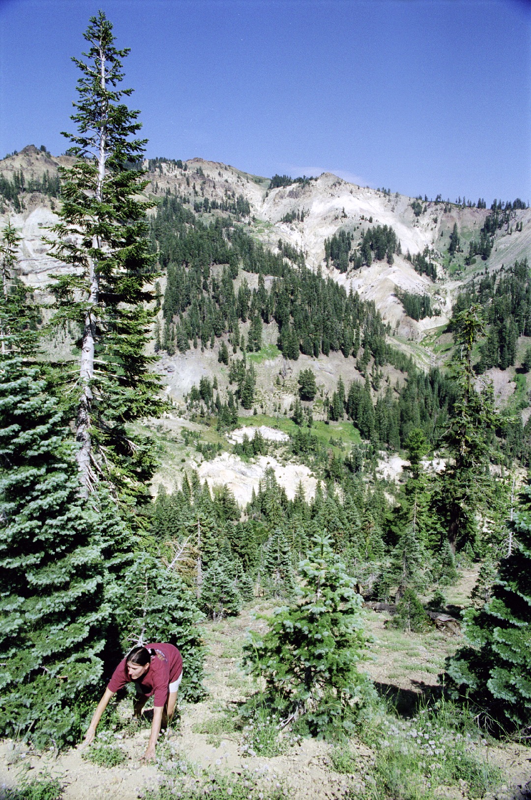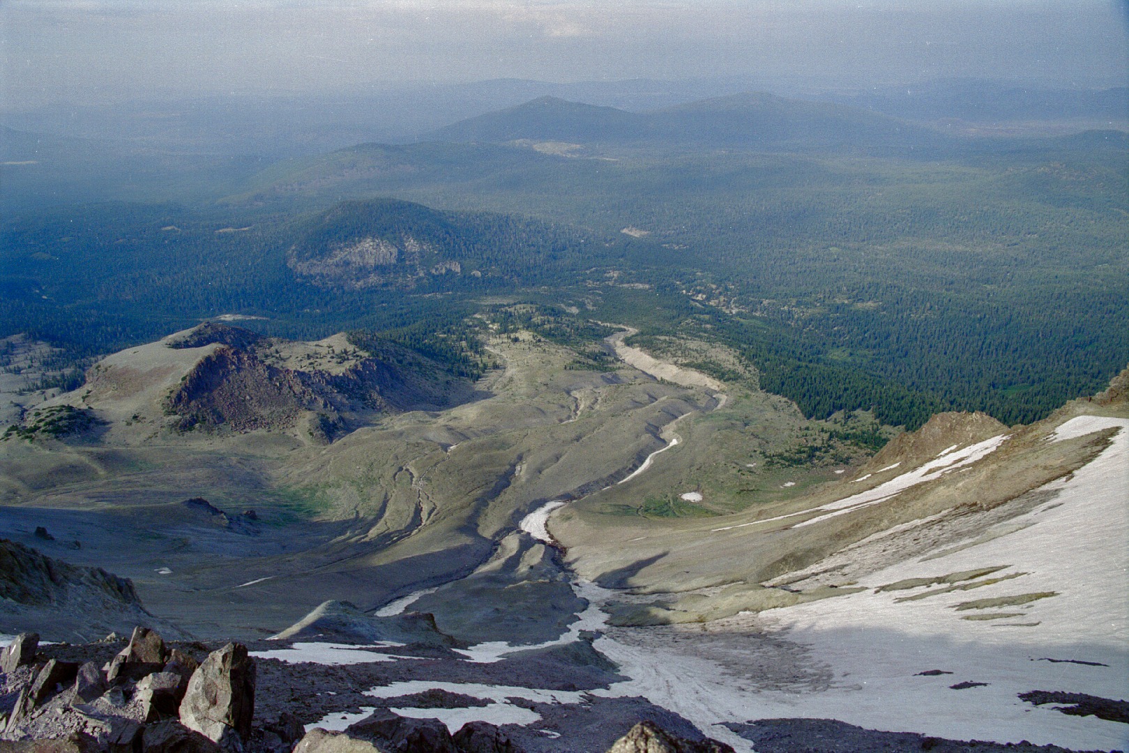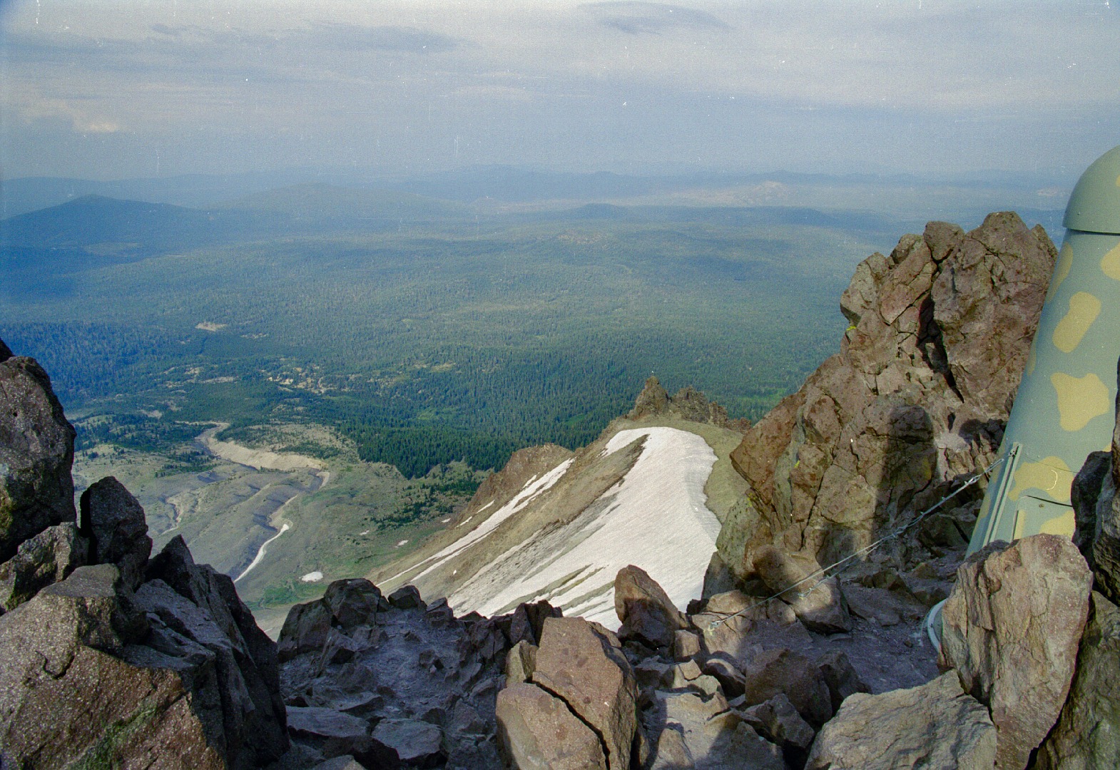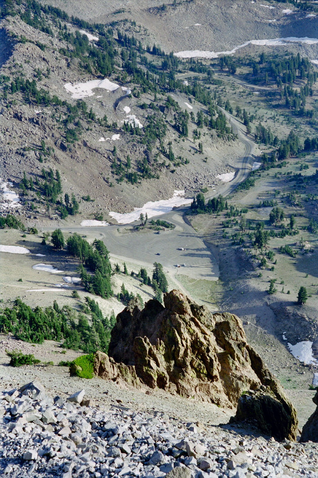 Eventually, LASSEN PEAK (10,457 feet) got conquered. I must truthfully admit that I felt overcome, too. The top includes a crater, an air traffic radio beacon, and offers a view down, over a lava slope. Lassen Peak exploded last time in 1920's and you can still see the damage.