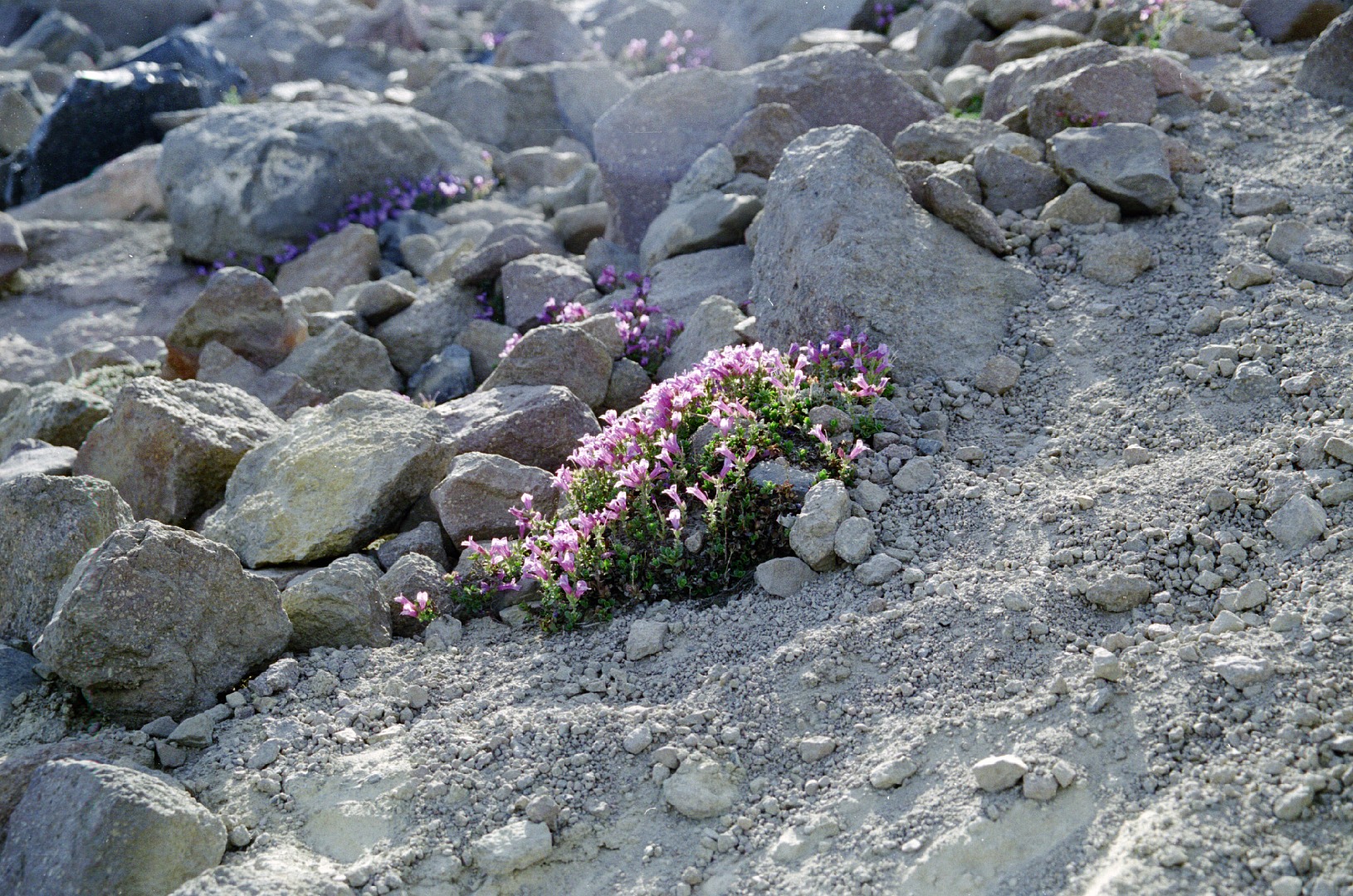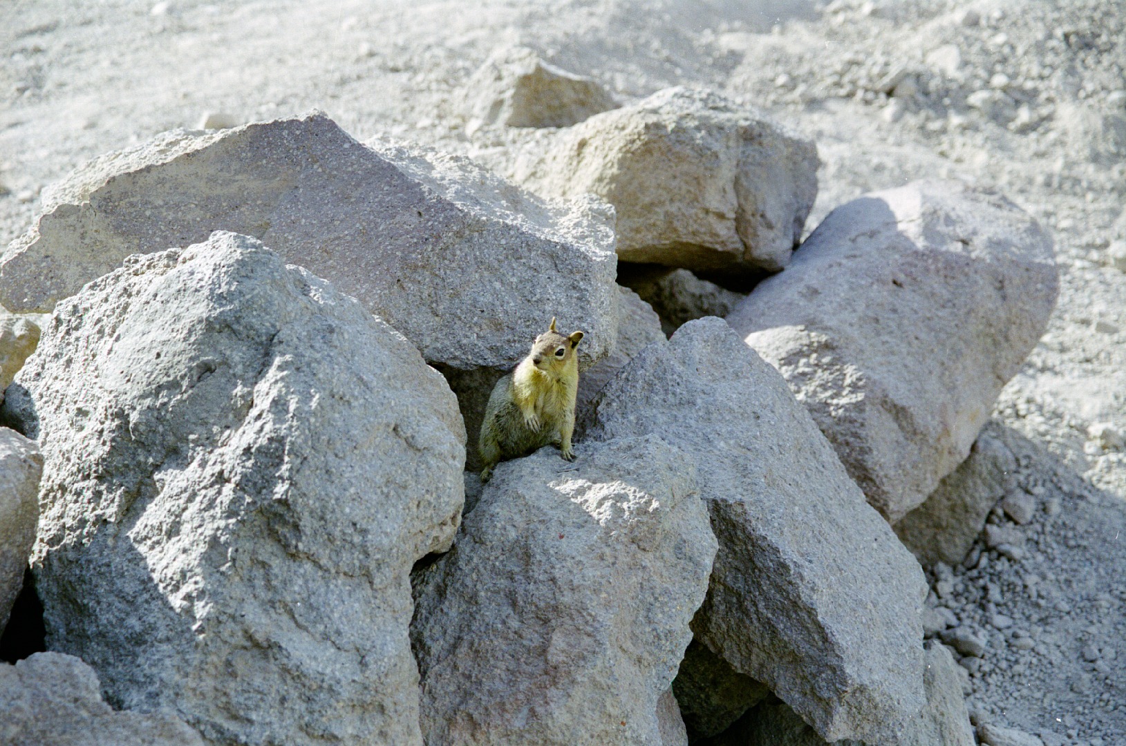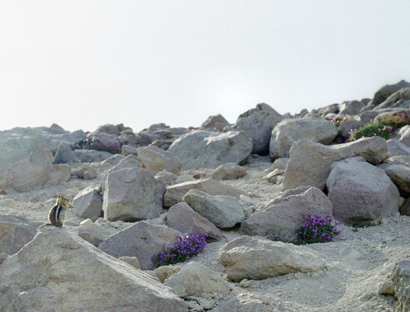 After a short discussion we elected to "run up" the Peak. The lower part was quite acceptable, a well trodden tourist trail curved under shady trees. At a higher elevation, remnants of last snow season crouched in every shady corner, awfully romantic. The higher we hiked, the more difficult it was to breathe. Trees gave way to bare rock and "moon climate" prevailed — hot in the sun, frosty in a shade. In the end, it was cold all the time. A short distance from the top, we got surprised by a plenitude of colorful flowers, growing among rocks on the slope. Ground squirrels hopped around in this garden (if you ever saw Disney's Chip & Dale, those are the ones). Quietly and very carefully, I took a picture of one. Sid watched me with a slight disagreement in his face, and then said, hmmmm, and walked up to about two steps away from the most courageous squirrel in the bunch, snapping his fingers. I expected the poor shy animal to get terribly scared, but he did not even think about it — he gazed quizzingly instead, if this huge man produces any lunch. Simply corrupted fuzzies.